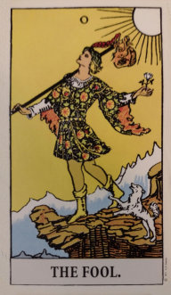 The Fool (0) starts on a new journey. He is eager about what may come but he has no experience yet and does not know what is ahead of him. This is the beginning of his travels (with his blanket stick for the new beginning), and he is open to what may come and excited. But does he see the cliff just ahead of him?