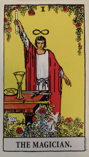 The Fool starts out on his journey and meets the Magician. The Magician represents action, creativity, and the masculine side of life. His is of our conscious awareness.
