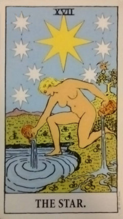 The Fool is absorbed with a peaceful calm. The woman pictured is naked, her soul no longer hidden. Luminous stars shine in a cloudless sky serving as a beacon of hope and encouragement. The Fool is blessed with confidence which completely replaces the disapproval of the Devil. His faith in himself and the future is restored. This peace after the storm is a magical moment for the Fool.