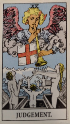 The Fool has been renewed. He has learned that joy, not fear, is at life's center. He has the tools he needs now. He may regret past mistakes, but he knows they were due to his lack of knowledge. He feels cleansed and recharged, and ready to start once more. It is time to make a more profound Judgement (20) about his life. He, as the angel, can choose wisely which to appreciate, and which to toss away.